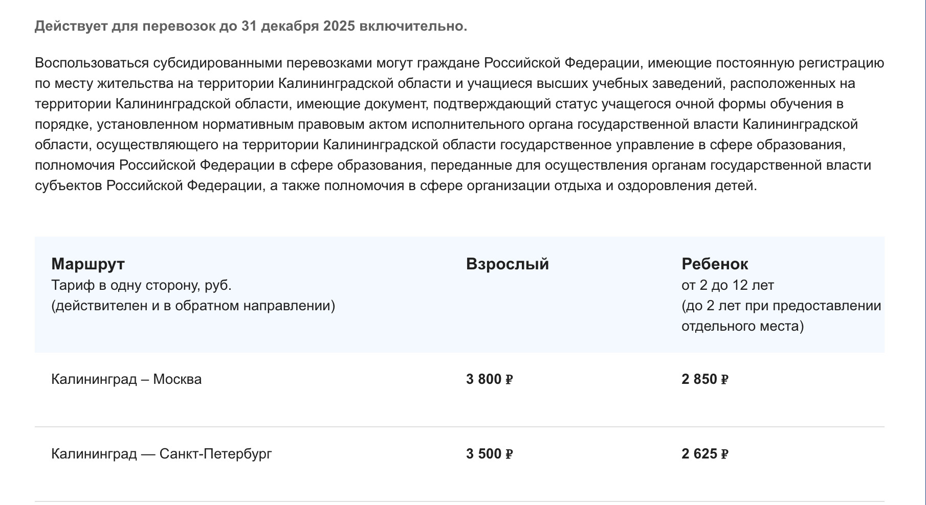 Для справки: Воспользоваться субсидированными перевозками могут граждане Российской Федерации, имеющие постоянную регистрацию по месту жительства на территории Калининградской области и учащиеся высших учебных заведений, расположенных на территории Калининградской области, имеющие документ, подтверждающий статус учащегося очной формы обучения в порядке, установленном нормативным правовым актом исполнительного органа государственной власти Калининградской области, осуществляющего на территории Калининградской области государственное управление в сфере образования, полномочия Российской Федерации в сфере образования, переданные для осуществления органам государственной власти субъектов Российской Федерации, а также полномочия в сфере организации отдыха и оздоровления детей.