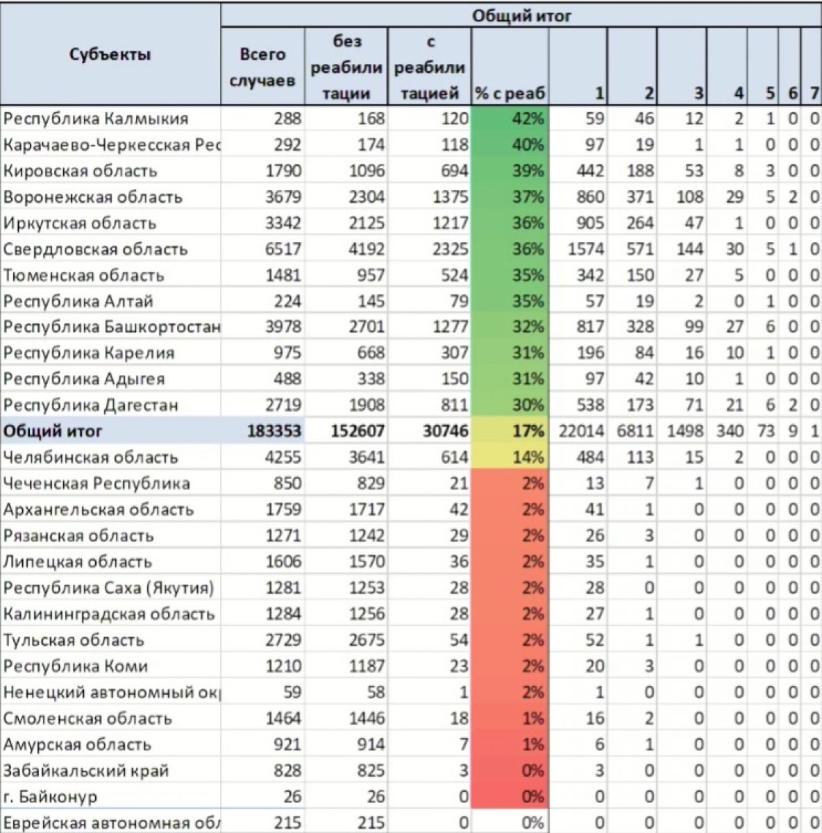 В антирейтинг вошли Еврейская автономная область, Забайкальский край, Байконур, Ненецкий автономный округ, республики Коми и Якутия, а также Тульская, Амурская, Смоленская и Калининградская области. Даже у лидеров статистики уровень реабилитации не превысил 42% от числа нуждающихся.