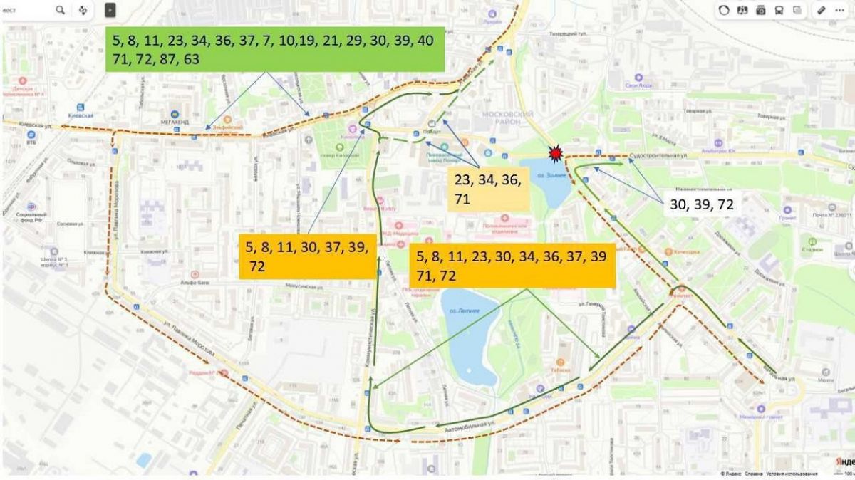 Основной объезд для транспорта будет проходить по улицам Автомобильной и Коммунистической. Общественный транспорт, включая троллейбусы, следующие с Батальной на Инженерную, будет направлен по маршруту: Автомобильная – Коммунистическая – Судостроительная – Киевский переулок. Транспорт, следующий на Судостроительную, поедет по Батальной – Автомобильной – Коммунистической через район «Киноленд». Движение в обратном направлении будет организовано по улицам Киевской – Павлика Морозова – Автомобильной.