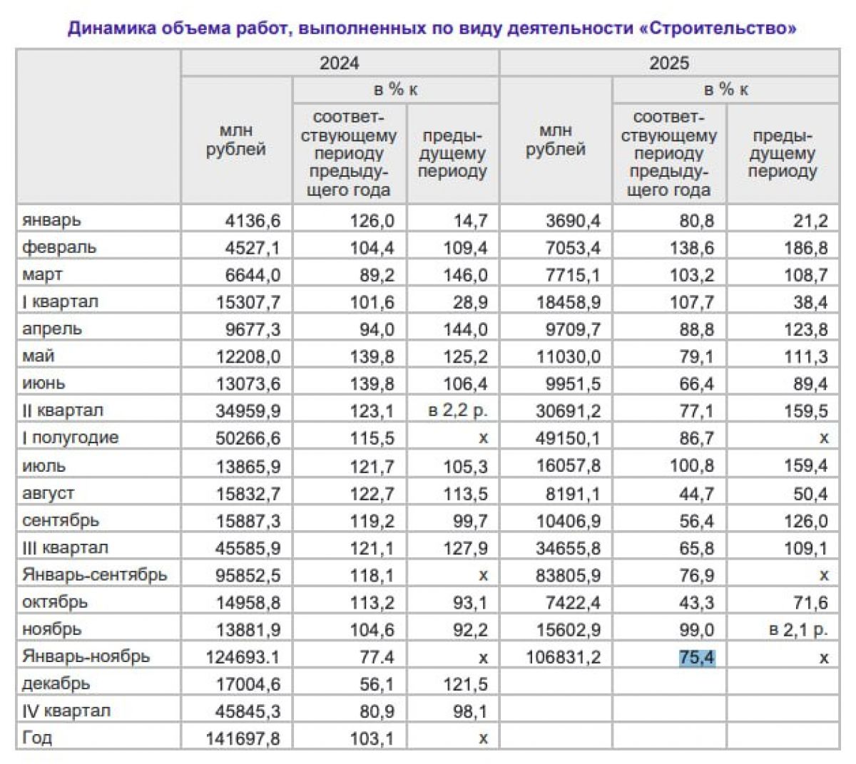 Статистика также указывает на сокращение перспективной загрузки отрасли. Обеспеченность строительных организаций договорами и заказами на конец ноября оценивается всего в 4 месяца. Это означает, что при сохранении текущих темпов работы, объёма существующих контрактов хватит лишь до весны. Общая стоимость этих заказов на будущие периоды составляет 22,9 млрд рублей.