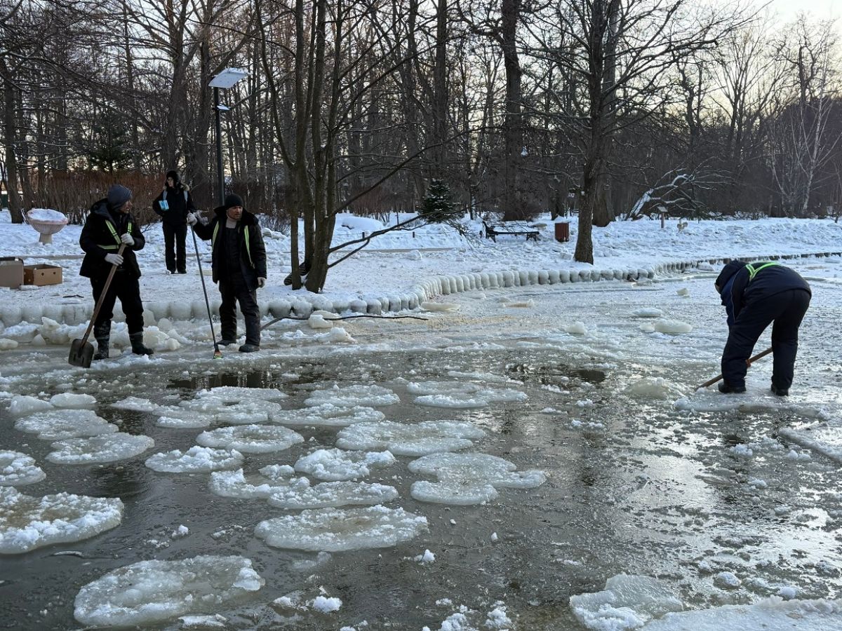 Администрация города отправила на помощь сотрудников муниципального учреждения «Благоустройство». Рабочие вручную разламывают лёд, стараясь расширить пространство с открытой водой. Однако их труд осложняет погода: пресная вода на сильном морозе покрывается льдом буквально за несколько часов.