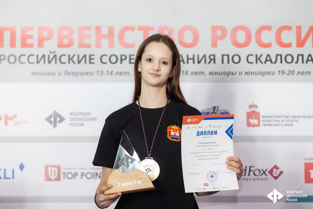 У девушек 13-14 лет победу одержала наша скалолазка Ксения Татищева.