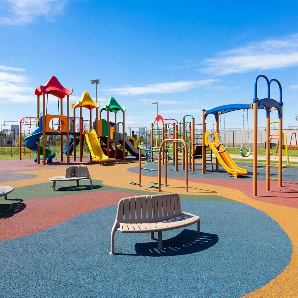 Объект расположен на улице Комсомольской, в непосредственной близости от центральной площади. В рамках контракта предусмотрено устройство нового резинового покрытия установка скамеек и урн, замена сетчатого ограждения на спортивной площадке, модернизация игровых элементов: канатов, лестниц, тросов, шведской стенки, качелей и каруселей.