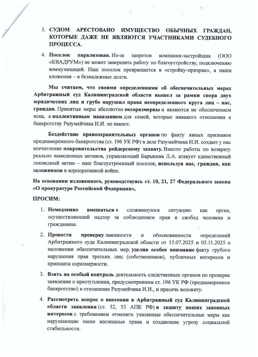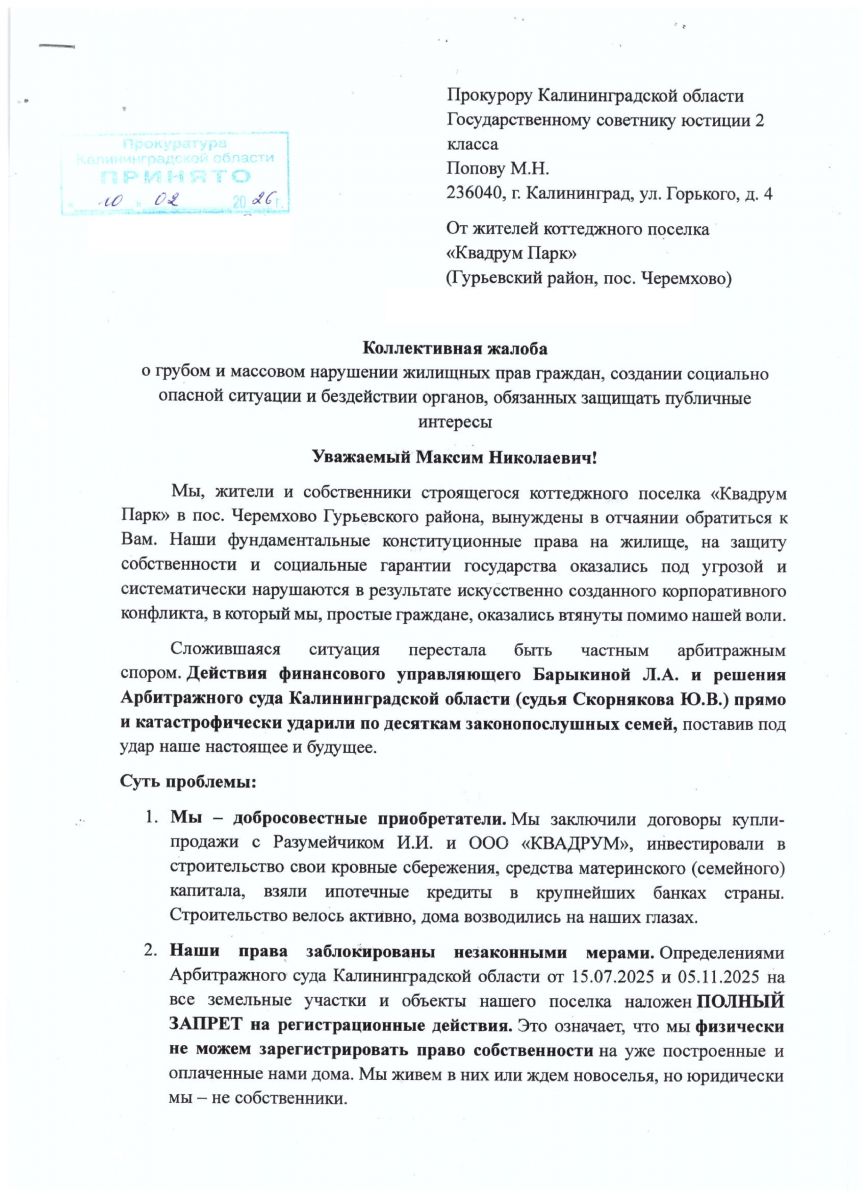 К началу 2026 года ситуация стала обостряться. Пока суд и бизнес всесторонне выясняли, кто на что имеет права, незримая, но самая социально уязвимая часть этого спора — жители посёлка, начали бить тревогу. В феврале из-за ареста земли под их домами граждане обратились в коллективной жалобой к прокурору Калининградской области Максиму Попову. А в апреле — к губернатору Алексею Беспрозванных.