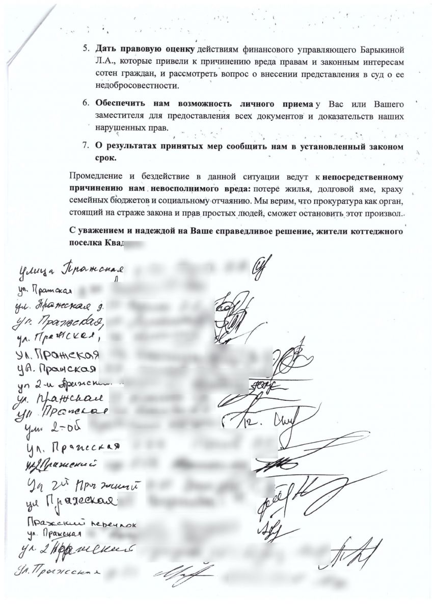 Мы заключили договора купли-продажи с ООО «КВАДРУМ» [застройщик — ред.], инвестировали в строительство свои сбережения, средства материнского (семейного) капитала, взяли ипотечные кредиты… Но наши права заблокированы. На все земельные участки и объекты нашего посёлка наложен полный запрет на все регистрационные действия. Это означает, что мы физически не можем зарегистрировать право собственности на уже построенные оплаченные нами дома!